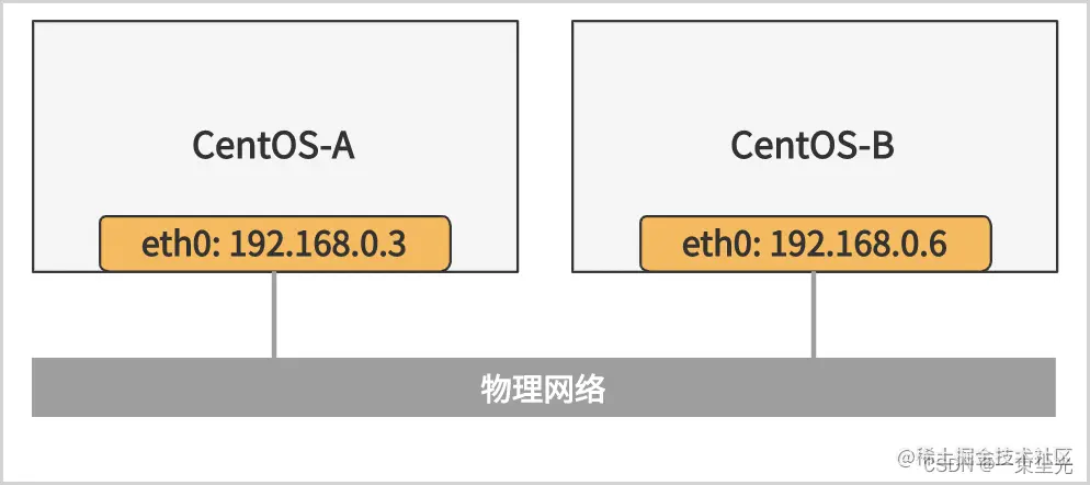 两台机器之间通过物理网络可以互相通信,如下图所示