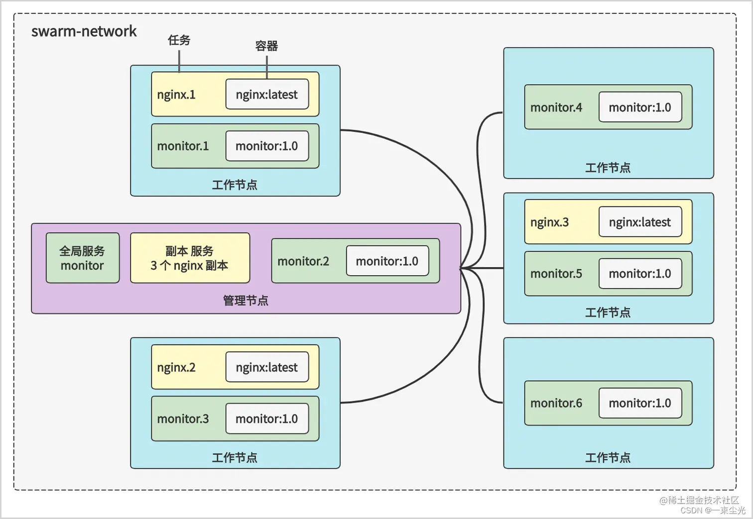 Service 相当于绘制一张施工蓝图,Swarm 则根据蓝图的细节,分配 Task 到不同的 Node 上干活