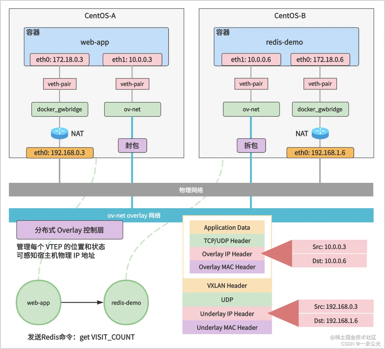 如图所示,假设 2 台 CentOS 主机上的 2 个容器都已经连接到 ov-net 网络中,CentOS-A 上的 web-app 容器想要发送一条 Redis 命令到 CentOS-B 上的 redis-demo 中的 Redis 服务,查询网站当前的访问次数