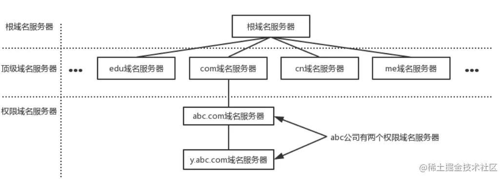 在域名的每一层都会有一个域名服务器,如下图: