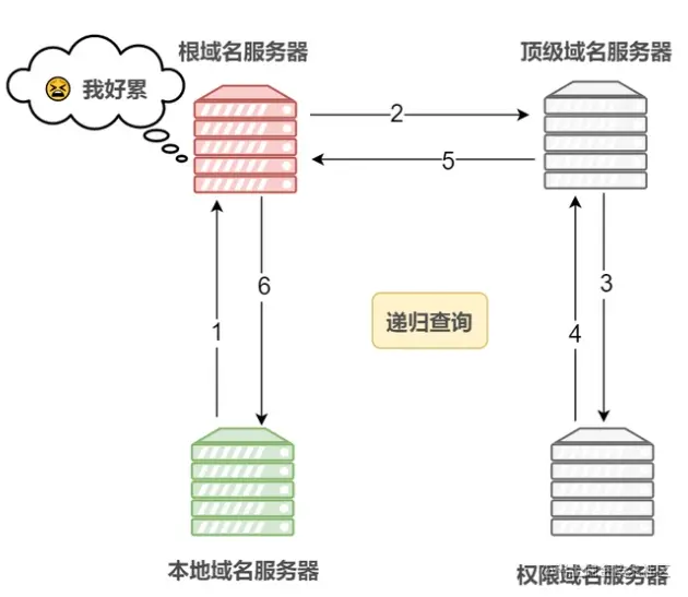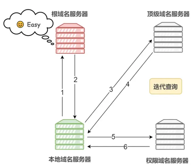 - 迭代查询:如果接收者 B 没有请求者 A 所需要的准确内容,接收者 B 将告诉请求者 A,如何去获得这个内容,但是自己并不去发出请求