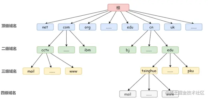 域名是一个具有层次的结构,从上到下一次为根域名、顶级域名、二级域名、三级域名...