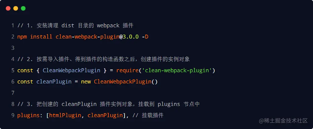 为了在每次打包发布时自动清理掉 dist 目录中的旧文件,可以安装并配置 clean-webpack-plugin 插件: