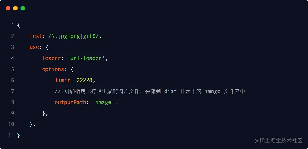 修改 webpack.config.js 中的 url-loader 配置项,新增 outputPath 选项即可指定图片文件的输出路径: