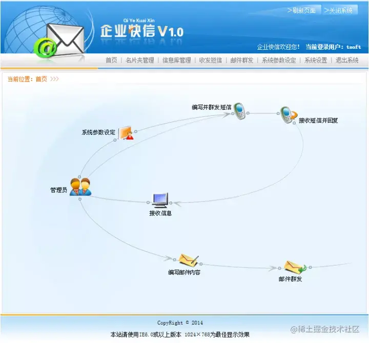 计算机网络的出现到现在已经经历了翻天覆地的重大改变。因特网也从最早的供科学家交流心得的简单的文本浏览器发展成为了商务和信息的中心。到了今天,互联网已经成为了大量应用的首选平台,人们已经渐渐习惯了网络交易,渐渐对网络产生了依赖。公司会议、机票预定、酒店预定、公司之间货物订单的下达等等工作都可以通过网络快速的完成。网络已经渗透到了人们生活中的方方面面,甚至已经延伸至人们日常的衣食住行各个领域。本项目就是在此背景下设计的企业快信系统。