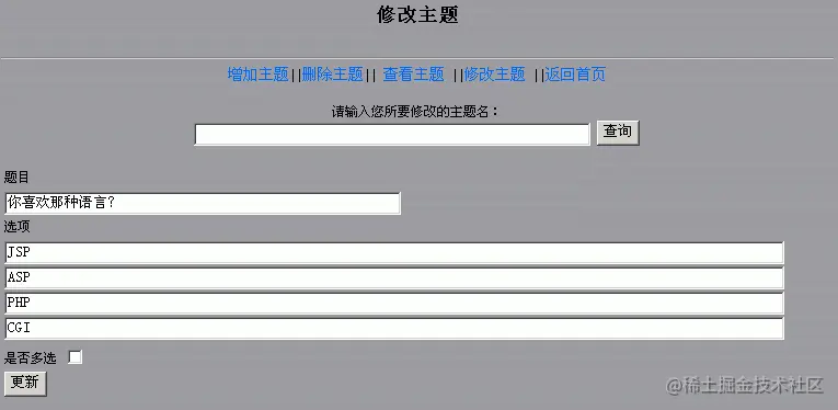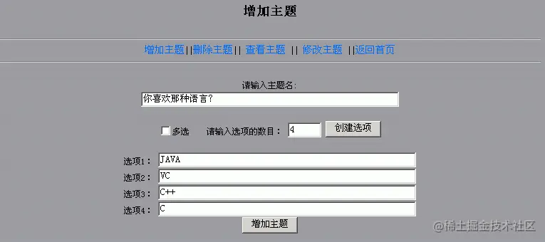 - 在首页中点击“投票设计“链接后,即可打开投票设计中的”增加主题“,同时你会看到投票设计中的其它几项功能:删除主题、查看主题、修改主题、返回首页。增加主题的方法如下图所示: