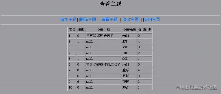 - 投票表:存放投票信息,数据项包括:序号、标识、选项类型、投票主题、投票选项内容、得票数。