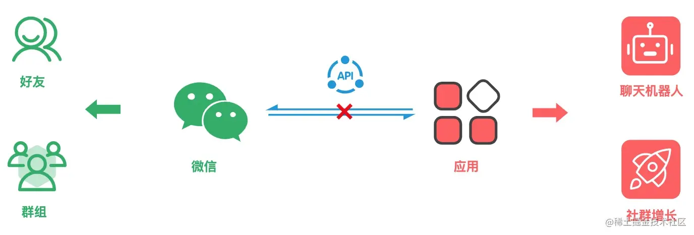 这些应用的实现都离不开与微信的对接。但是,微信自身并未提供任何的接入工具,也没有提供任何可用的 SDK 或 API。这是横亘在微信和各类应用之间的沟壑,也是各个开发者不得不面对的事实。当然,这条 “沟壑” 只能由开发者自己来解决,本文主要来介绍如何搭建这样一套 API,来作为一个桥实现应用与微信之间的交互。有了这套桥 API 就可以跨过那条沟壑。