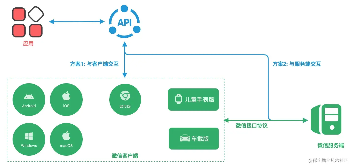 桥 API 实现与微信交互的方案主要有两种,一种是基于客户端交互实现,另一种是直接使用微信的接口协议与服务端交互。
