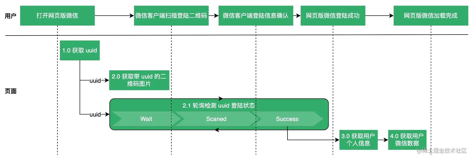 - 第一步:用户打开网页版微信。首先页面要请求服务端生成一个 uuid,这个 uuid 会作为用户的唯一标识;紧接着,使用 uuid 生成一个二维码图片;与此同时,开始不停的发送请求,轮询 uuid 登陆状态,此时的登陆状态为