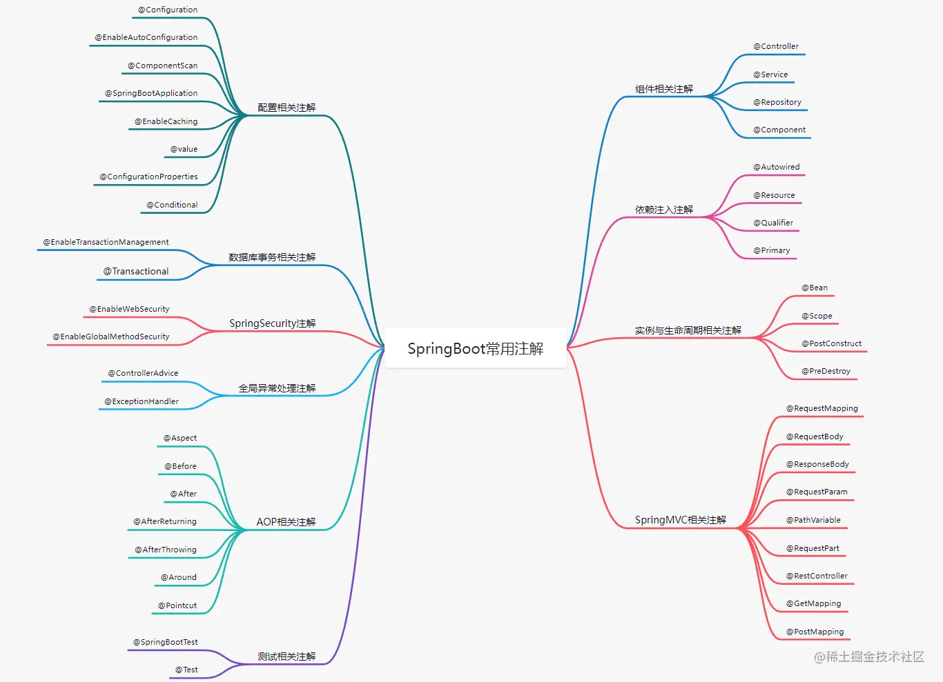 这里整理了一张SpringBoot常用注解的思维导图,本文主要讲解这些注解的用法。