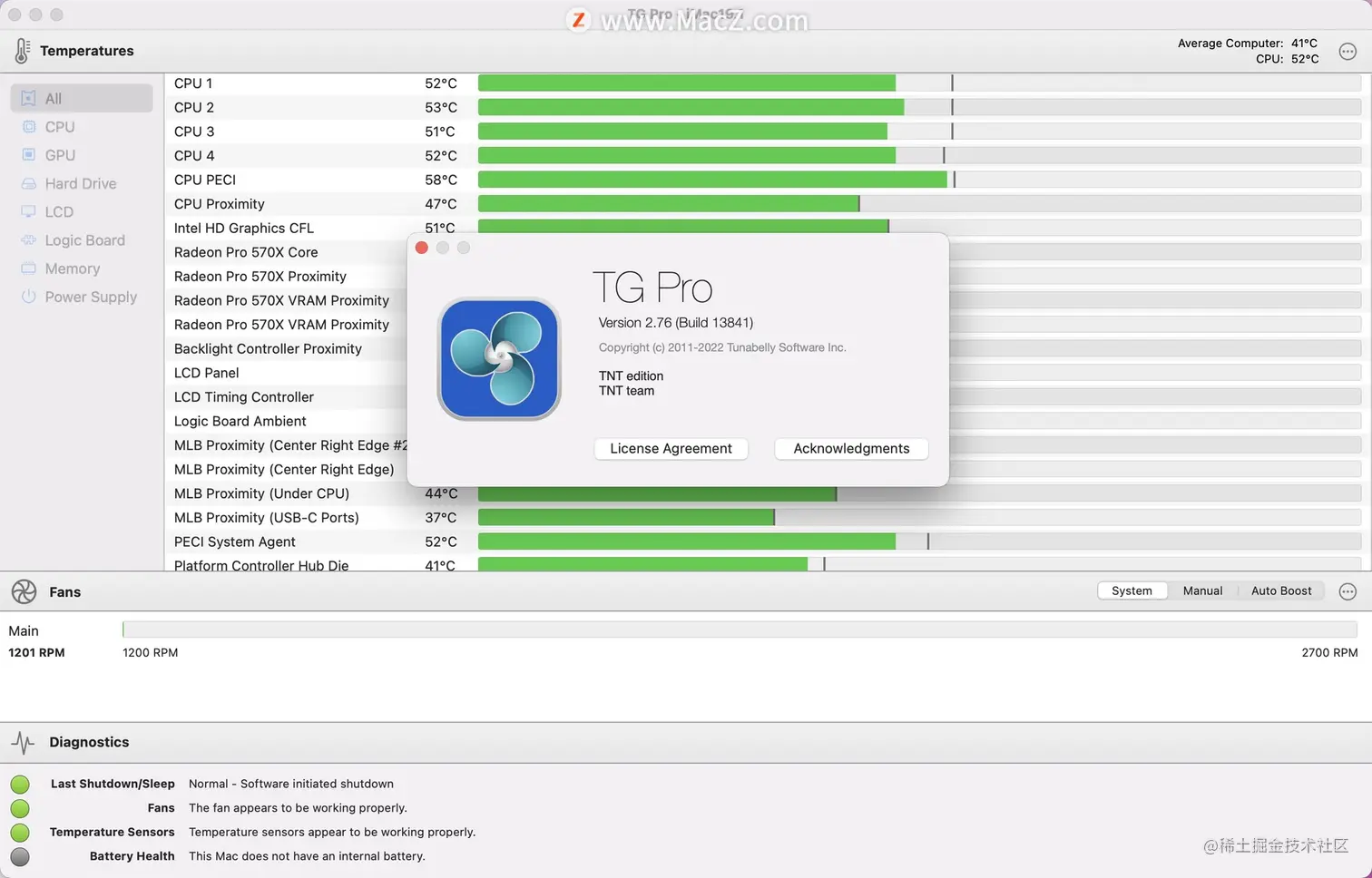 想要实时检测你的硬件是否温度过高?TG Pro for mac软件分享给大家!TG Pro Mac版是一款功能强大的硬件温度检测工具,可以快速查看CPU,GPU,逻辑板或硬盘驱动器温度,检查电池运行状况和其他硬件诊断,并且帮助保持Mac凉爽并快速运行。