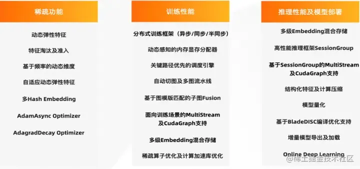 总的来讲,TensorFlow 的 Embedding Layer 对真实的业务场景有几个不太友好的点,第一是可拓展性差,第二是 hash 冲突导致模型训练有损,第三是无法处理冗余的稀疏特征。而 DeepRec 巧妙地解决了上述问题,主要提供了基于 Embedding Variable 的动态 Embeeding 功能和特征准入/淘汰功能。