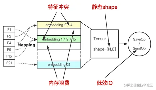 为了规避上述的 OOV 问题,通常做法是将特征值 hash 到一定的范围,但是又会引入 hash 冲突的问题,导致不同的特征值共用同一个 Embedding,会造成信息丢失,对模型训练是有损的。