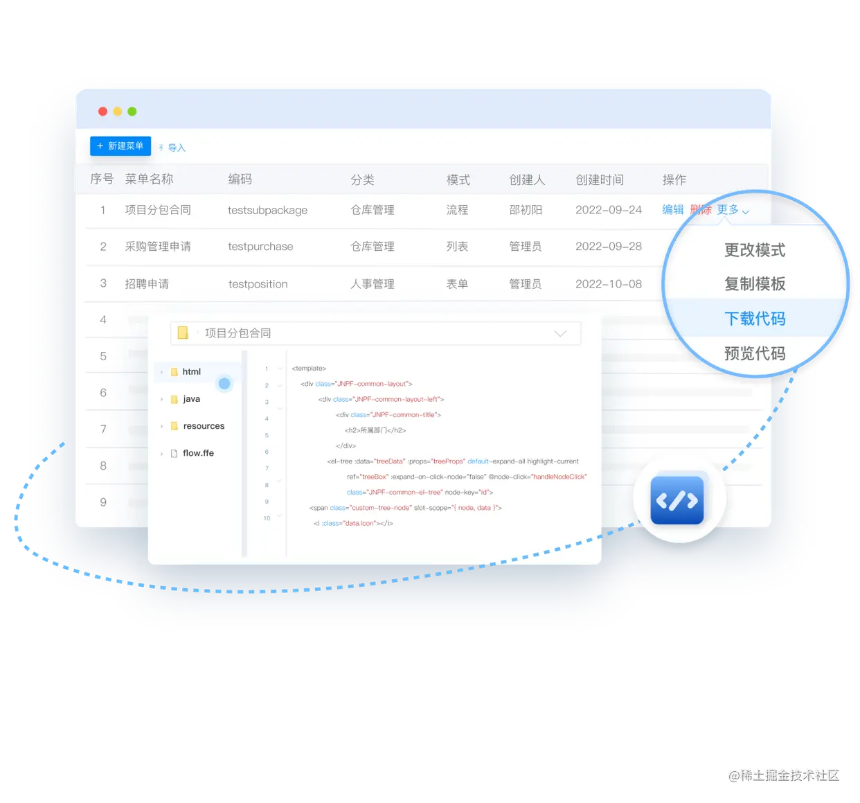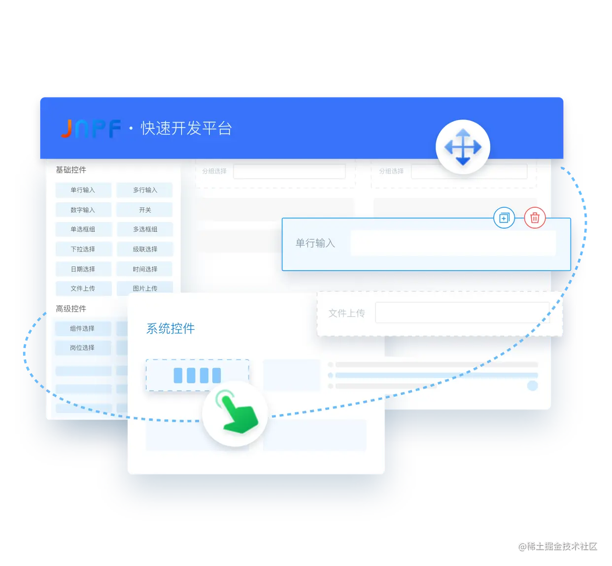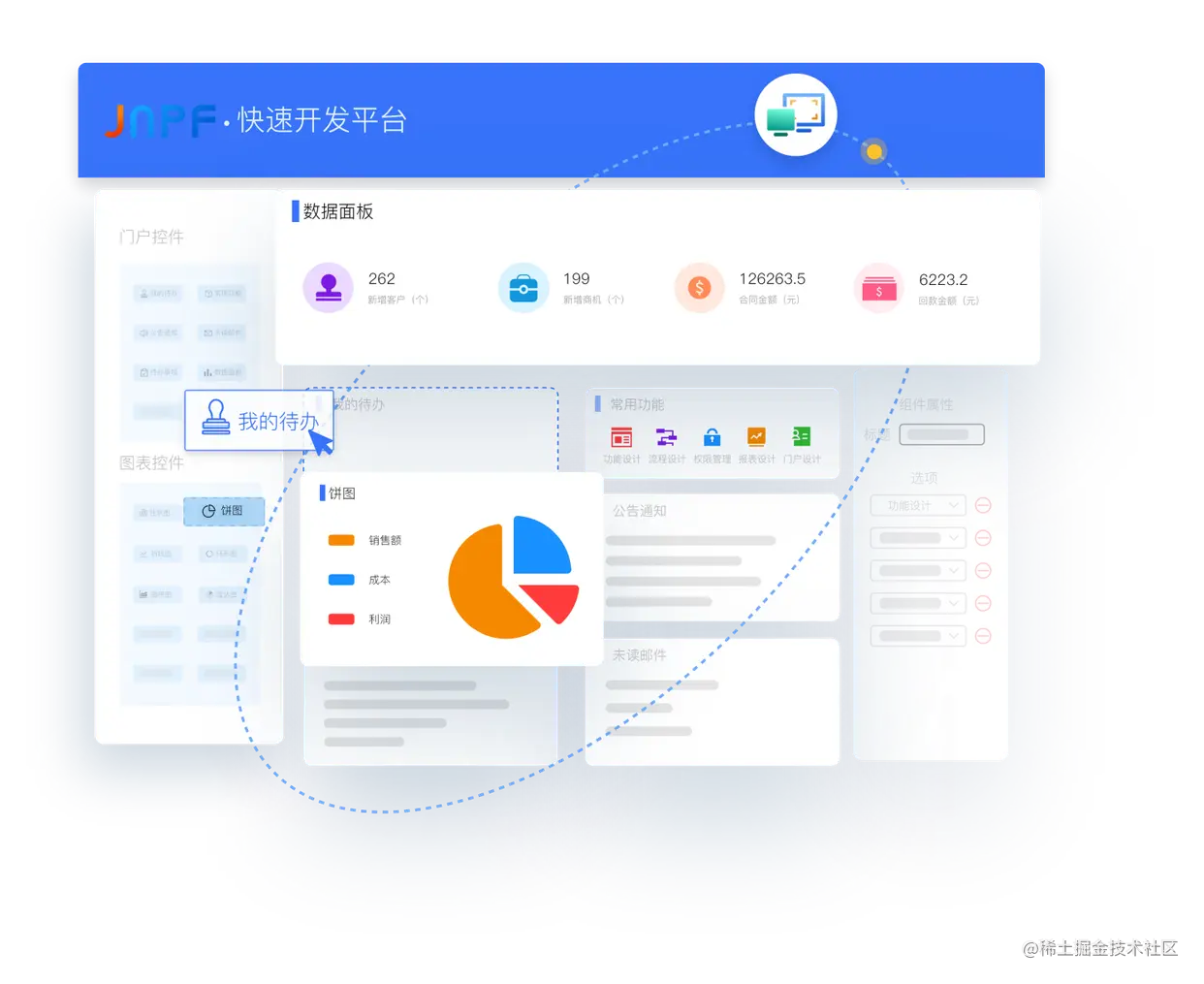 JNPF快速开发平台通过拖拽页面的方式,帮助企业快速构建企业级应用程序,简化了繁琐的开发配置,提高了开发效率,简化了部署流程。而且可以引入大量业务人员承担部分甚至全部产品开发工作,逐渐成为企业降本增效、实现数智化的重要方式。欢迎试用体验:www.yinmaisoft.com/?from=jueji…