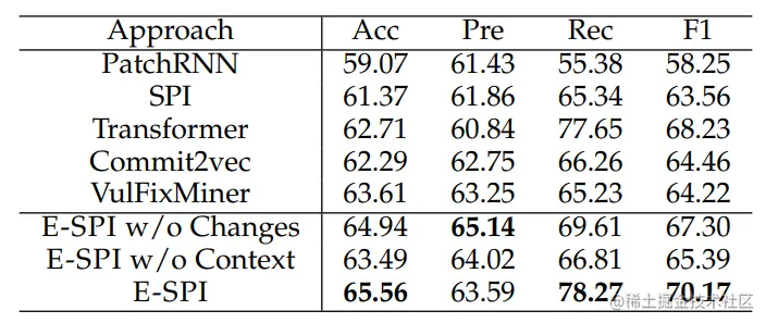 首先,这篇文章从整体上对所有的模型进行了比较,结果(见下图)显示E-SPI达到了SOTA,这表明,相对其他的方案,E-SPI能更好的对代码提交进行建模。通过进一步观察发现,代码提交信息是安全补丁识别问题的重要特征,加入提交信息的模型(Stacking、PatchRNN、SPI、Transformer、E-SPI)显著比没有加入代码提交信息的模型(Commit2Vec、VulFixMiner)要好,即使架构最简单的Stacking模型(添加了代码提交信息特征)也比只使用修改代码的模型Commit2Vec,VulFixMiner结果要好;另外可以发现,在特征相同的情况下,Transformer-Based的模型(Transformer)反而没有BiLSTM-Based的模型(PatchRNN,SPI,E-SPI)结果好,这有可能是样本不足,导致Transformer-Based模型训练不充分。