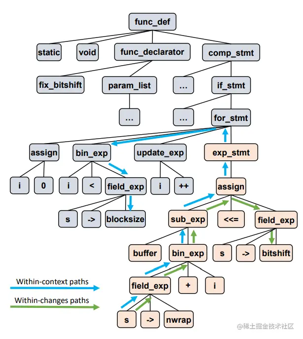 代码修改编码器:对于代码提交中代码修改,该方案首先抽取代码修改前的函数Pre-function 和代码修改后的函数Post-function ;接着对着两个函数进行AST解析,为了适配序列模型的输入,该方案创新的提出了AST Path提取方法,将、对应AST的图转换成两类AST Paths:Within-context paths、Within-changes paths,其中Within-context paths代表AST树上开始的节点在修改代码中,结束节点不在修改的代码中的路径,Within-changes path代表AST树上开始和结束都在修改代码中的路径;最终以1:1的比例随机分别选取K个Within-context paths 和Within-context paths,来表征代码修改,输入Bi-LSTM完成代码修改的Embedding。
