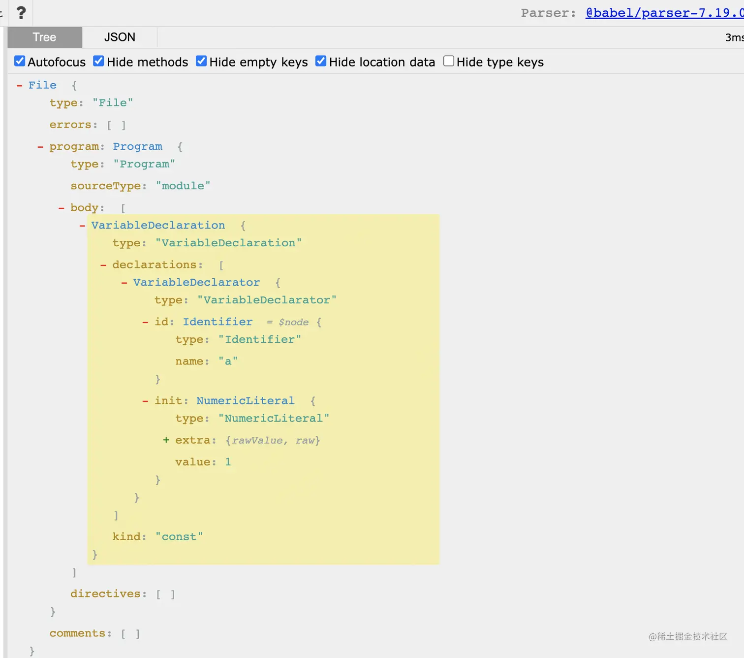 经过这一步的处理,最终 const a = 1 会变成如下ast结构: