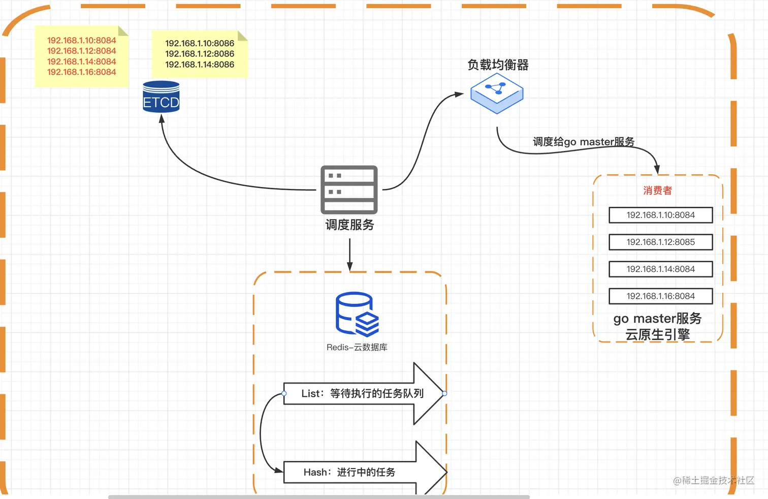 leader节点负责从redis中获取任务,根据负载均衡算法,将任务派发给对应的go master服务。