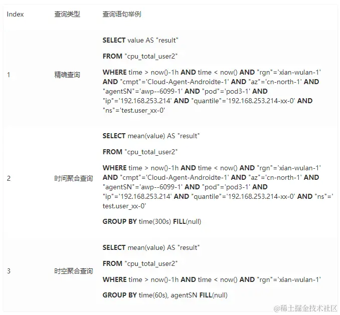 查询性能是我们重点考虑的方面,测试工具Jmeter,测试场景从业务中挑选了使用频率较高的三种类型查询语句,在此基础上变化查询并发数、查询时间范围、聚合算子等进行测试。