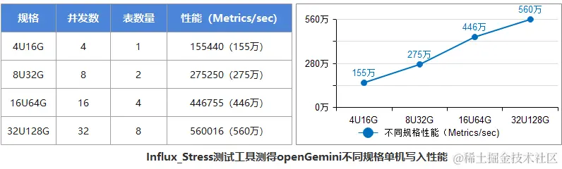 - 从4U的155万Metrics/s平稳增长到32U的560万Metrics/s
