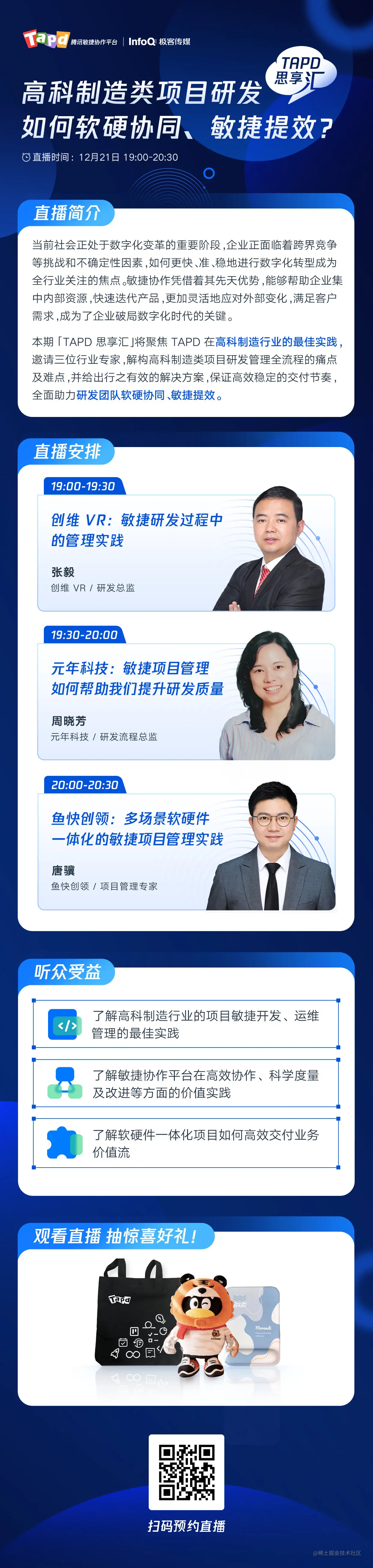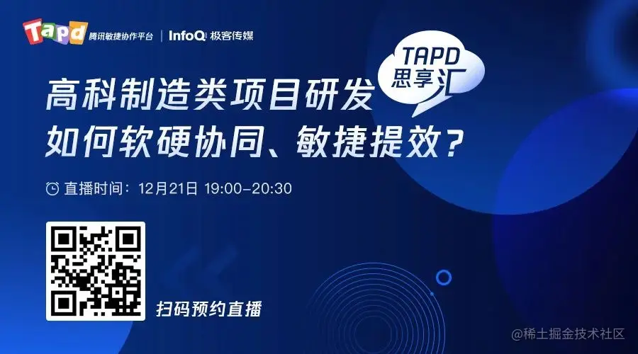本期 「TAPD 思享汇」将聚焦 TAPD 在高科制造行业的最佳实践,邀请三位行业专家,解构高科制造类项目研发管理全流程的痛点及难点,并给出行之有效的解决方案,保证高效稳定的交付节奏,全面助力研发团队软硬协同、敏捷提效。