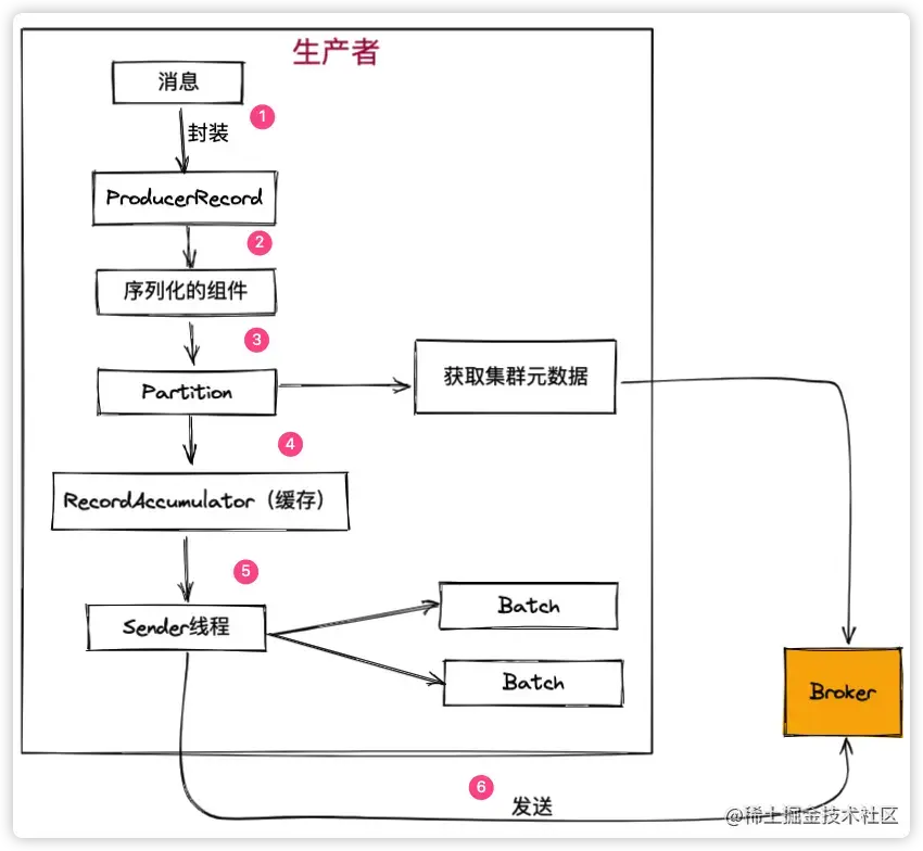 分好区的消息不会直接发送到服务端,而是放入生产者的缓存区,多条消息会被封装成一个批次(Batch),默认一个批次的大小是 16KB