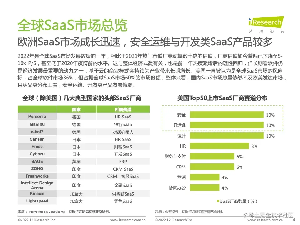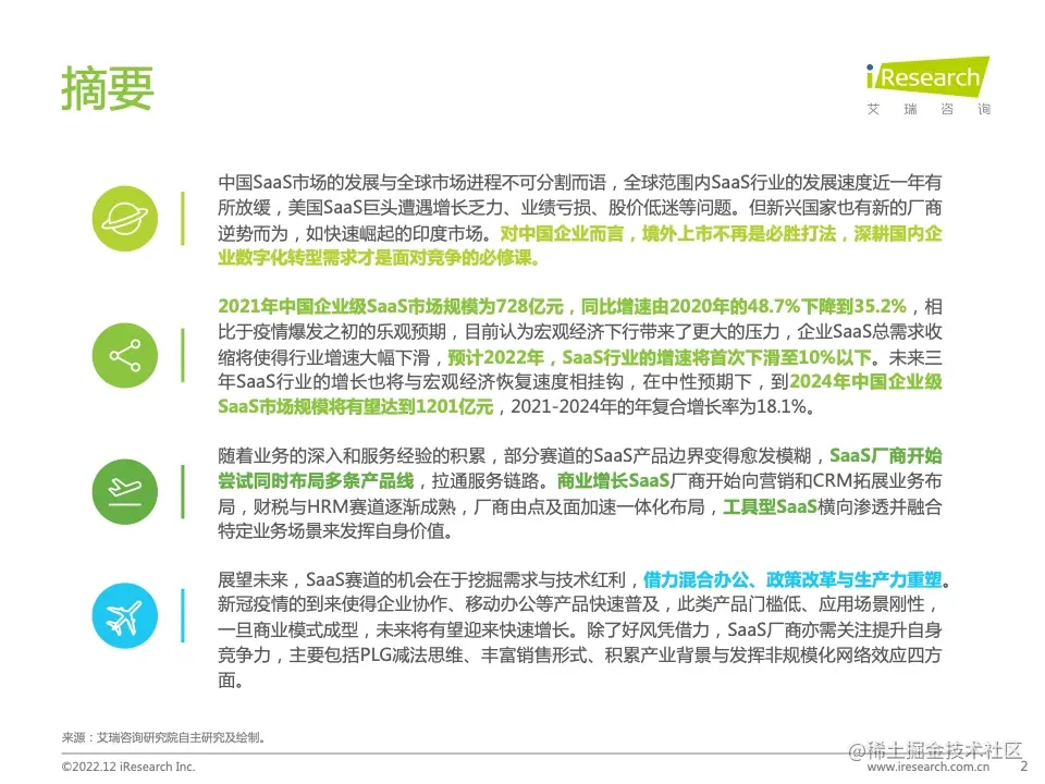 本报告首先着眼于全球市场,分析在富有挑战的经济环境下的新模式新机会,进而对中国SaaS市场的规模、细分结构、估值情况展开分析,其次分析了产业链中渠道商与云市场两类角色,并对SaaS和低代码加以对比,最终展望行业发展前景。