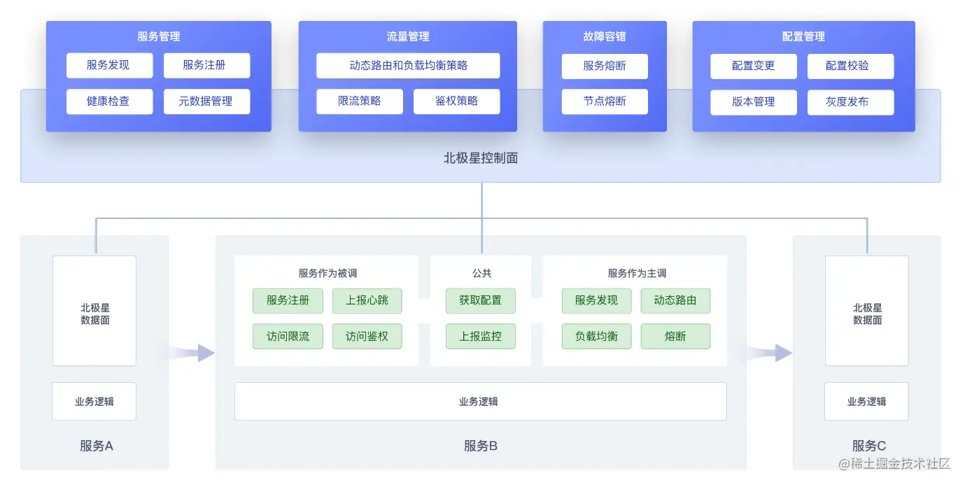 为了解决上面的问题,降低用户开发及运营微服务的门槛。北极星为服务治理提供一站式解决方案,覆盖服务注册中心、服务网格和配置中心的功能。用户只需要部署一套北极星,即可在任意的基础设施上,完整的使用北极星提供的路由灰度、熔断降级、限流鉴权等功能,快速构建微服务架构。