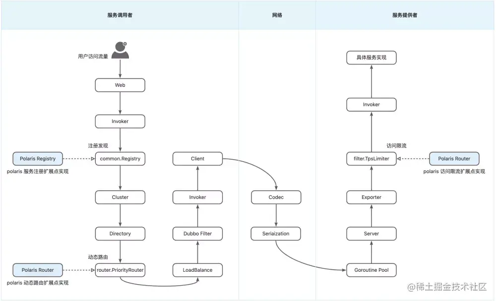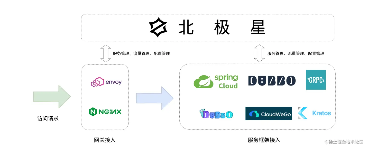Dubbo框架:与Spring Cloud类似,北极星也提供了dubbo以及dubbogo框架的原生扩展,dubbo用户可以通过变更配置的方式接入北极星,无需进行代码的修改。