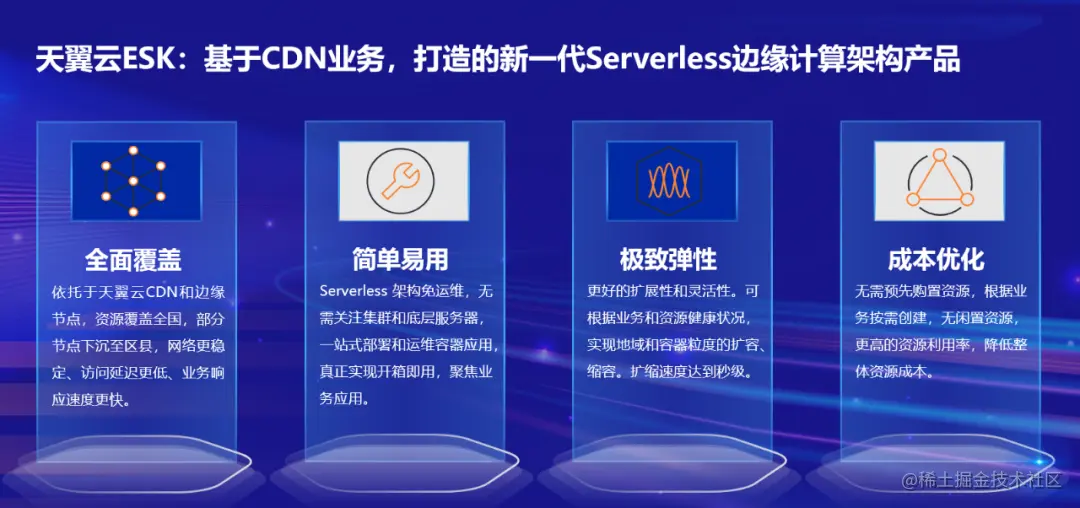 为助力企业实现应用极简上云、促进业务发展,天翼云基于智能边缘云ECX、CDN节点资源、云原生技术和智能调度策略,推出具有资源全面覆盖、简单易用、极致弹性、成本优化等功能优势的天翼云Serverless边缘容器 (简称ESK)。