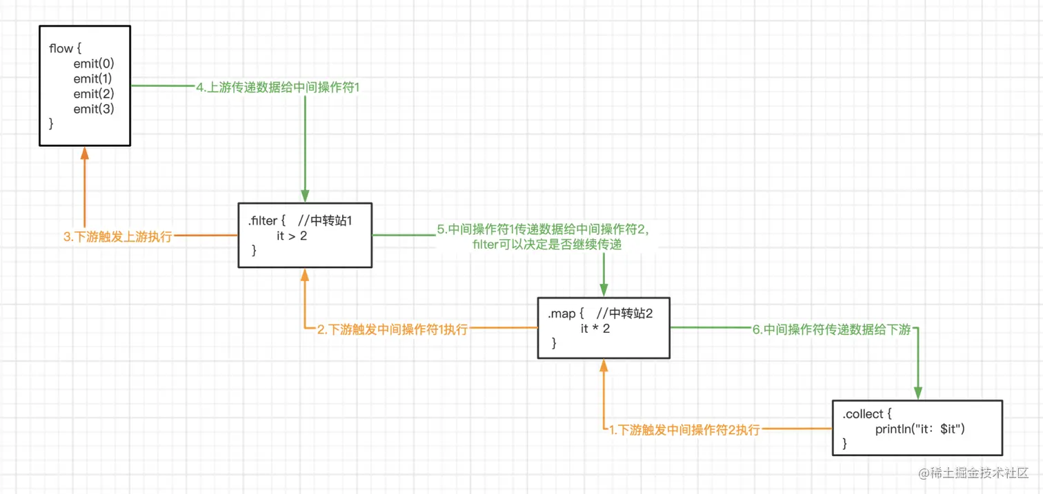 collect{},这里是在调用上游 Flow 的collect{},触发上游的 Lambda 执行了,也就是注释5触发的Lambda的执行,然后注释 7 就会被执行; - 注释7:这里的