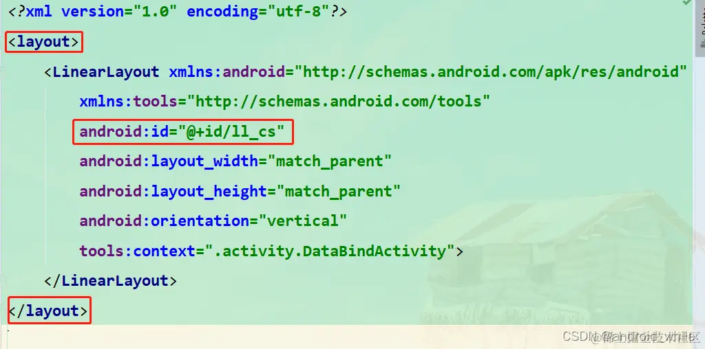 如下图所示,需要使用DataBinding绑定的布局需要在xml中使用将布局包裹起来
