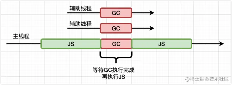 这就要说到并发回收了,它指的是主线程在执行 JavaScript 的过程中,辅助线程能够在后台完成执行垃圾回收的操作,辅助线程在执行垃圾回收的时候,主线程也可以自由执行而不会被挂起: