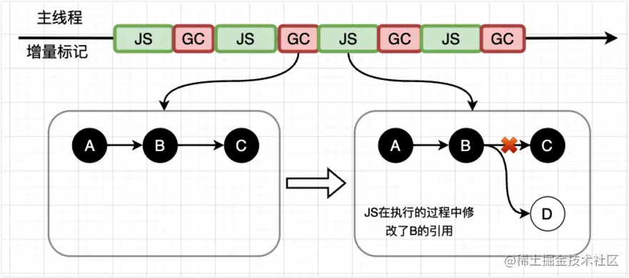 一次完整的 GC 标记分块暂停后,执行任务程序时内存中标记好的对象引用关系被修改了,增量中修改引用,简单来说就是 在GC中已经标记过之后,到JS线程的时候有将其引用修改。