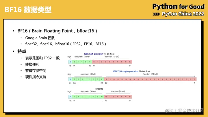 目前市面上尚没有可以大规模使用的支持 AMX 或者 SME 的硬件,在这个阶段我们应该如何优化 CPU 上的 AI 推理算力呢?我们首先要了解 BF16 数据类型。