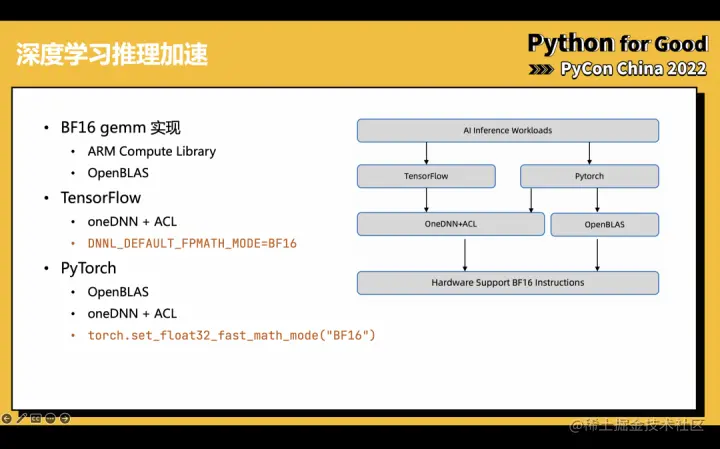 我们想要吸引一部分用户将AI应用从原先的 x86 平台上迁移到 ARM 平台上。这就要求 ARM 平台能提供更好的性能,或者更好的性价比。所以说如何整合 Python+AI 的相关软件使其发挥最好的性能成为了我们关注的重点。