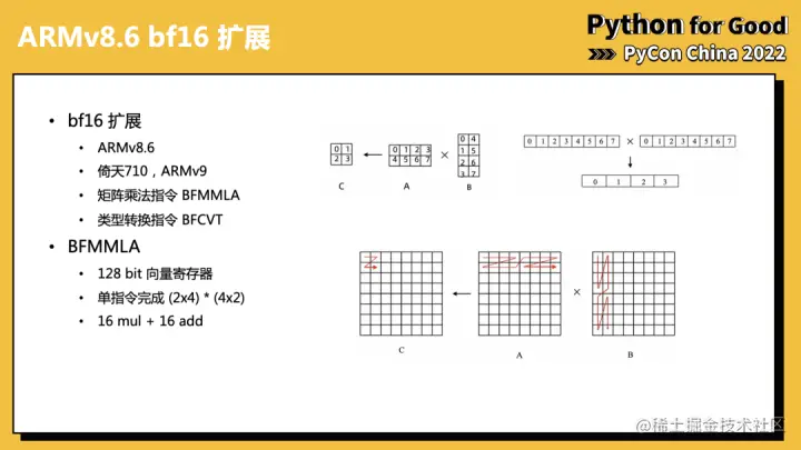 需要说明的是 BF16 的扩展包含在 ARMv8.6 设备上,当然倚天 710 是 ARMv9 的指令集,同样支持。我们主要通过 BFMMLA 来进行矩阵乘法计算,例如对于包含 128bit 的向量寄存器的设备来说: