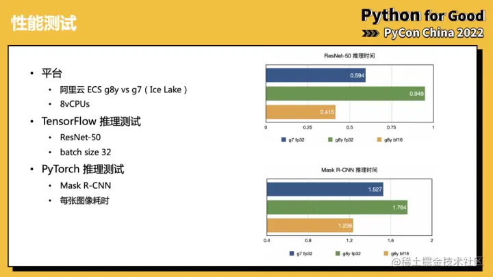 然后测试 TensorFlow 和 PyTorch 的性能对比,在对比中,我们可以看到,得益于 BF16 扩展,最新的 ECS ARM 平台上的性能优于 x86 平台(g7)。