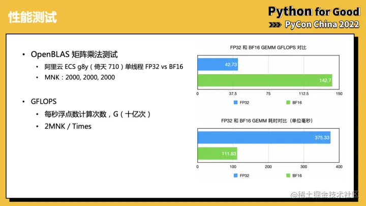 之后是一些性能测试的展示,我们测试了 OpenBLAS 纯矩阵计算的性能对比。分别记录了 GFLOPS 和执行时间两个指标。