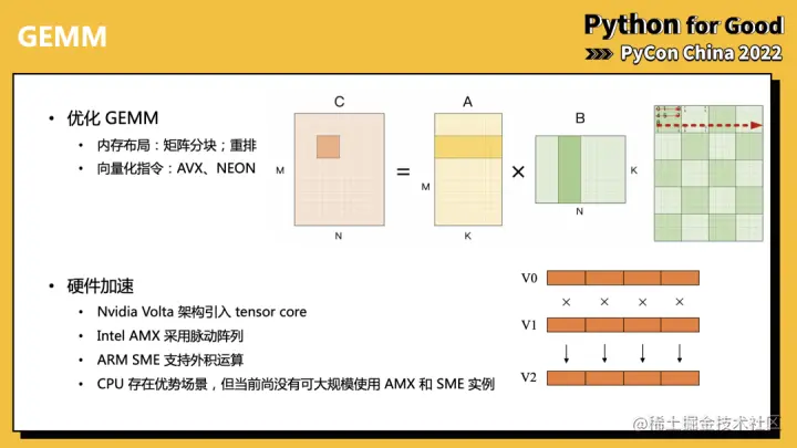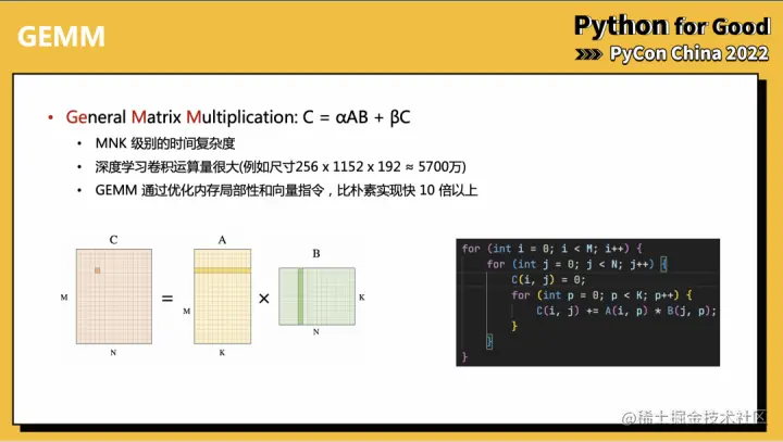 我们前面说的矩阵乘法,更准确的叫法是 GEMM,通用矩阵乘法,其实还包含系数和累加操作。但是时间复杂度仍然是 MNK 级别,主要还在于 AB 两个矩阵相乘。直观来看,深度学习涉及的矩阵乘法计算量很大,比如常见的卷积操作可能就涉及 5000 万次计算,所以优化就显得很有必要,右下图是最朴素的三层循环迭代法,这种做法通常非常慢,计算机科学家做了许多努力,从优化内存布局和利用向量指令出发,能够将性能提升 10 倍以上。