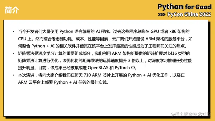 编者按:在刚刚结束的 PyCon China 2022 大会上,龙蜥社区开发者朱宏林分享了主题为《ARM 芯片的 Python+AI 算力优化》的技术演讲。本次演讲,作者将向大家介绍他们在倚天 710 ARM 芯片上开展的 Python+AI 优化工作,以及在 ARM 云平台上部署 Python+AI 任务的最佳实践。