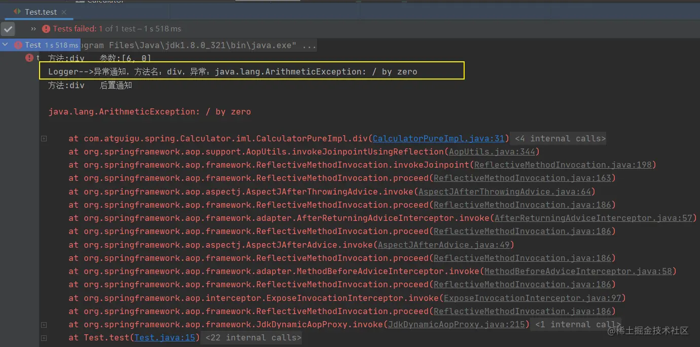 @AfterThrowing中的属性throwing,用来将通知方法的某个形参,接收目标方法的异常
