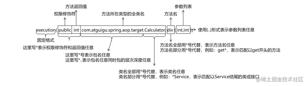 - 例如:execution(public int .. Service.*(.., int)) 正确