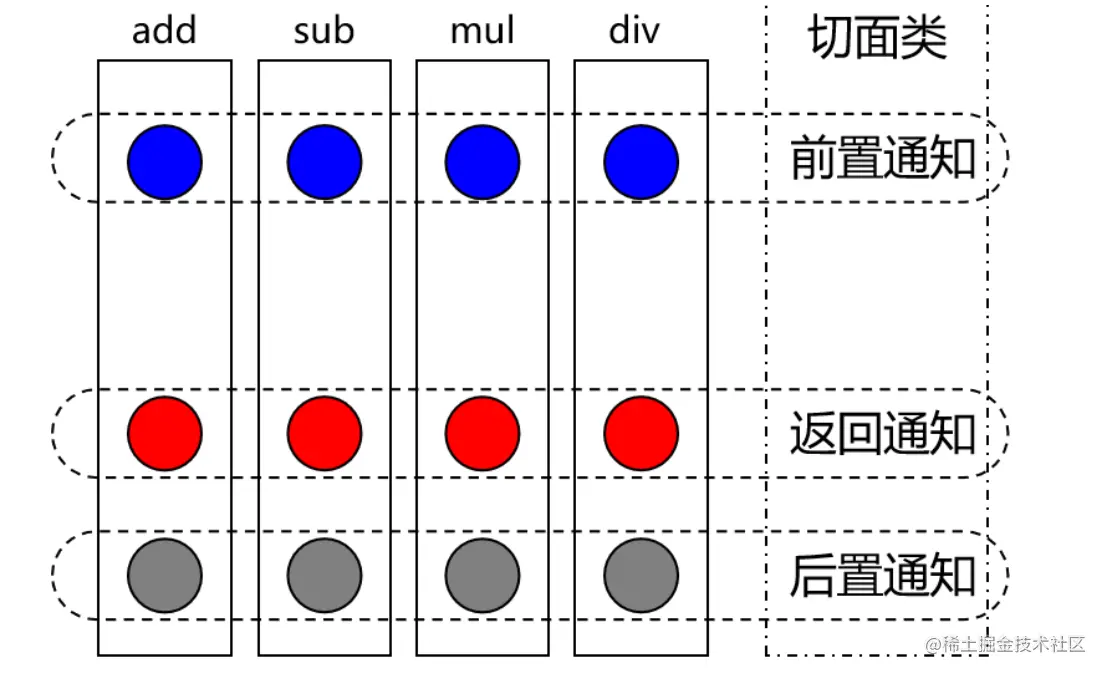 每一个横切关注点上要做的事情都需要写一个方法来实现,这样的方法就叫通知方法。