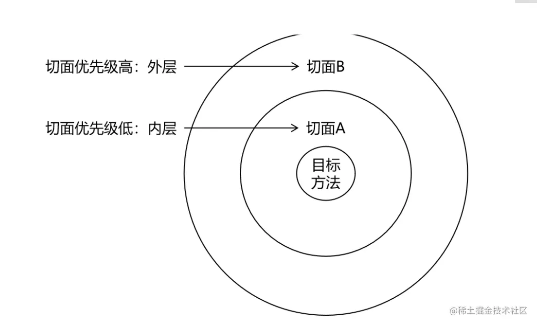相同目标方法上同时存在多个切面时,切面的优先级控制切面的内外嵌套顺序。
