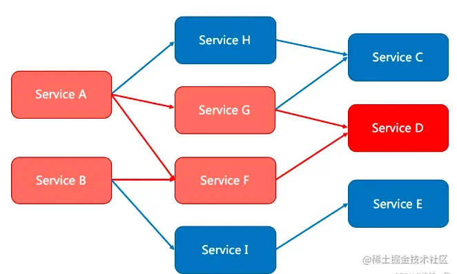 流量控制以外,降低调用链路中的不稳定资源也是Sentinel的使命之一。由于调用关系的复杂性,如果调用链路中的某个资源出现了不稳定,最终会导致请求发生堆积。这个问题和Hystrix里面描述的问题是一样的。如下图所示