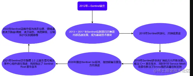 首先针对于Sentinel进行梳理一下对应的发展史,看看Sentinel是如何一步一步的发展起来的,Sentinel是2012年创立出来的,距今已经成长了10个年头了,接下来我们看看每个它阶段的成长经历吧!如下图所示。