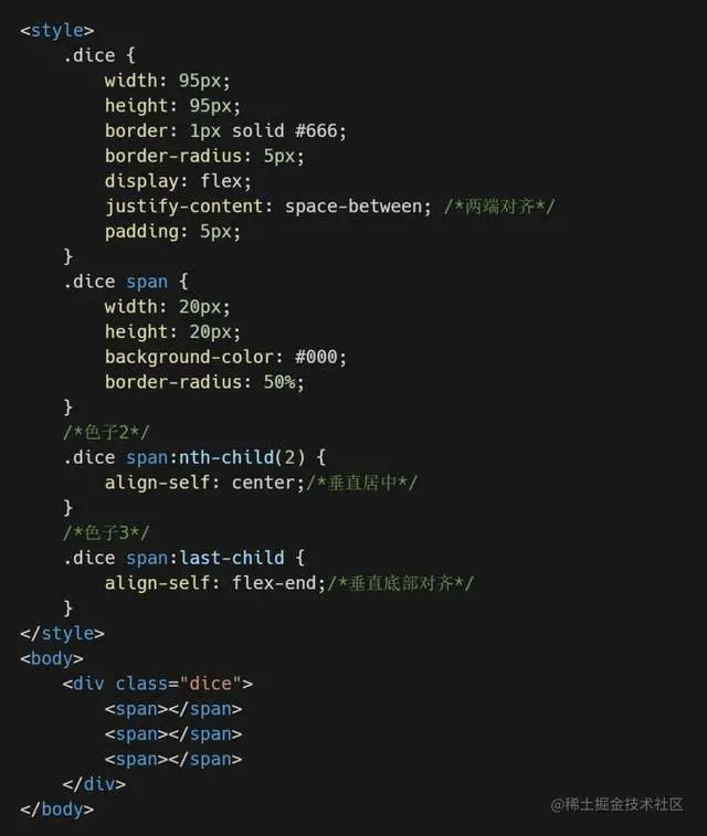首先给父容器加上justify-content: space-between; 使三个色子,两端对齐
