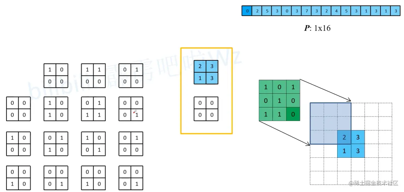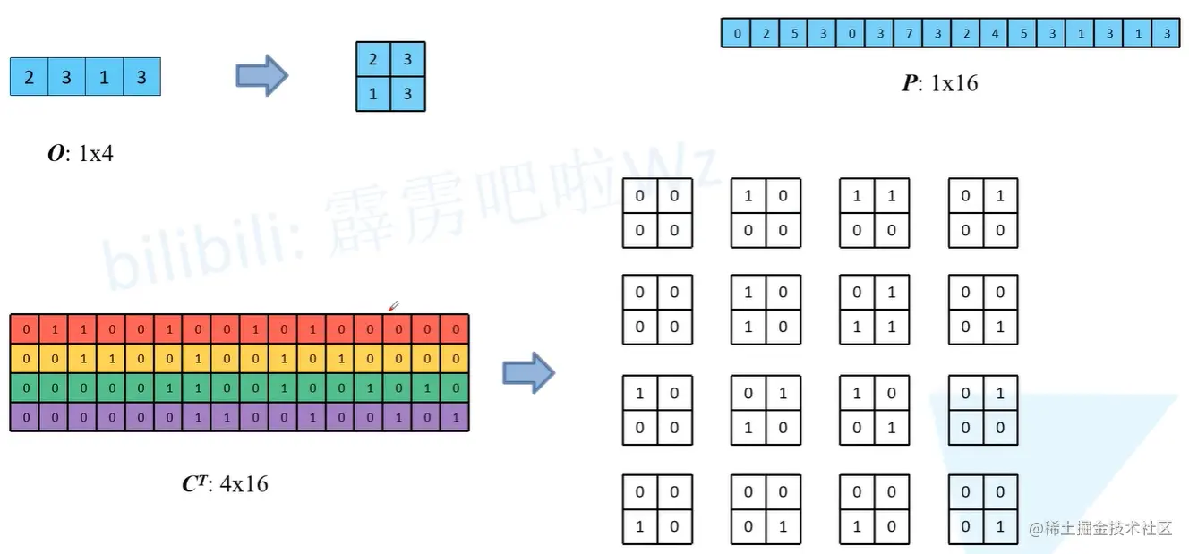 先将O还原回矩阵,再将的每一列变成一个等效矩阵,等效矩阵和O相乘相加就能得到P